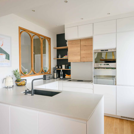La cuisine s'est ouverte sur l'espace de vie, devenant un lieu de partage. Les rangements ont trouvé leur place dans un long module sur mesure créé pour s'intégrer parfaitement sans alourdir l'espace.
